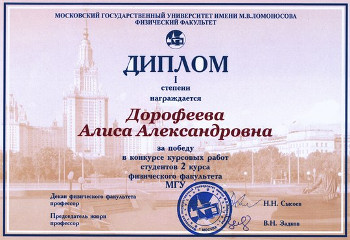Поздравляем Дорофееву Алису с первым местом в конкурсе курсовых работ студентов 2 курса Физического факультета МГУ (научный руководитель к.ф.-м.н., с.н.с. Дмитриев К.В.)