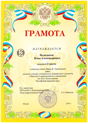 Поздравляем студента 624 гр. Недоспасова И.А., занявшего 2-е место в конкурсе имени И.В.Анисимкина работ молодых ученых, специалистов, аспирантов и студентов в Институте радиотехники и электроники им. В.А.Котельникова РАН (научный руководитель к.ф.-м.н., с.н.с. Можаев В.Г.)