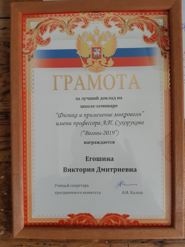 Студентка Егошина Виктория Дмитриевна награждена грамотой "За лучший доклад" на школе-семинаре Волны 2019.